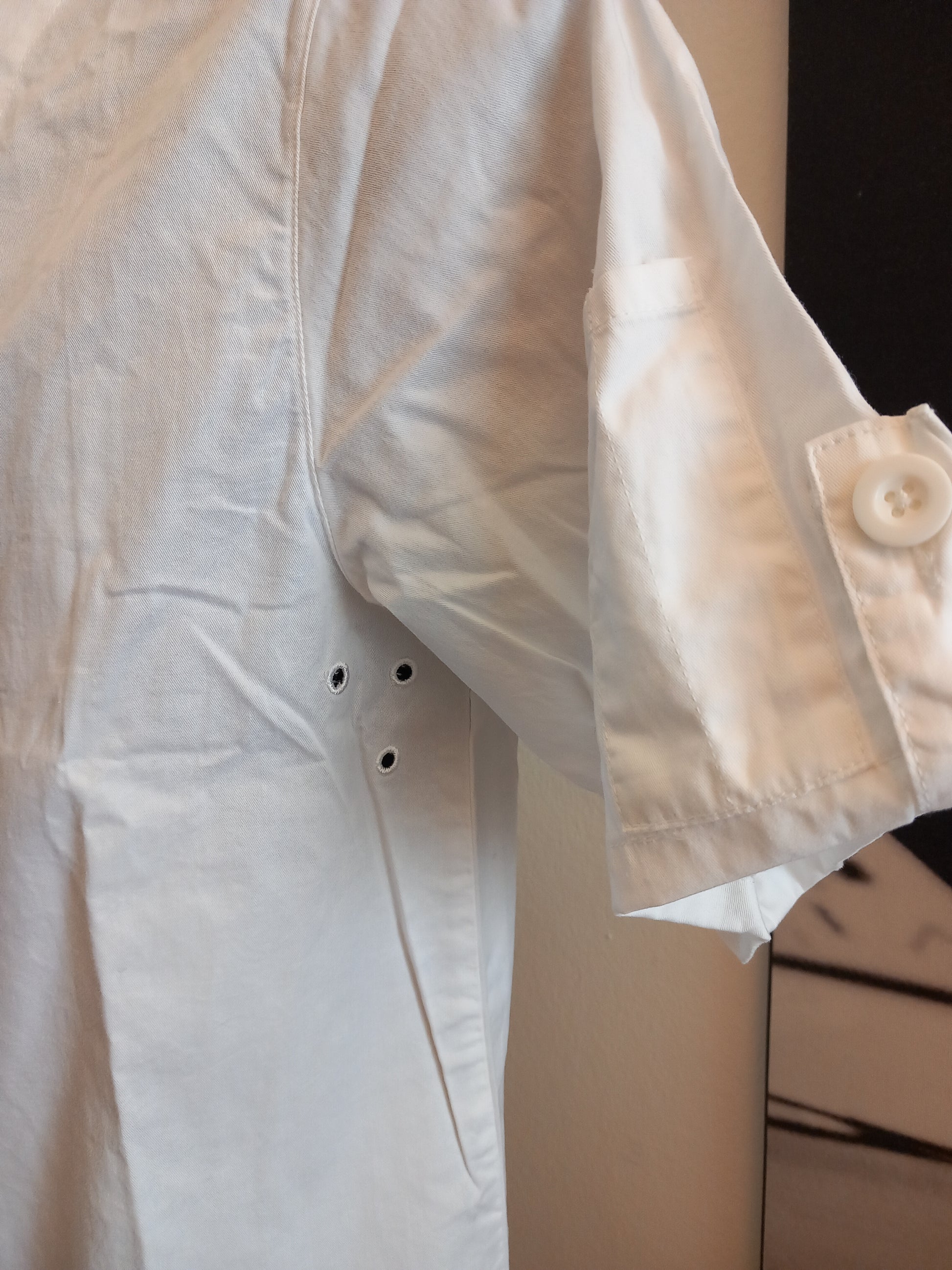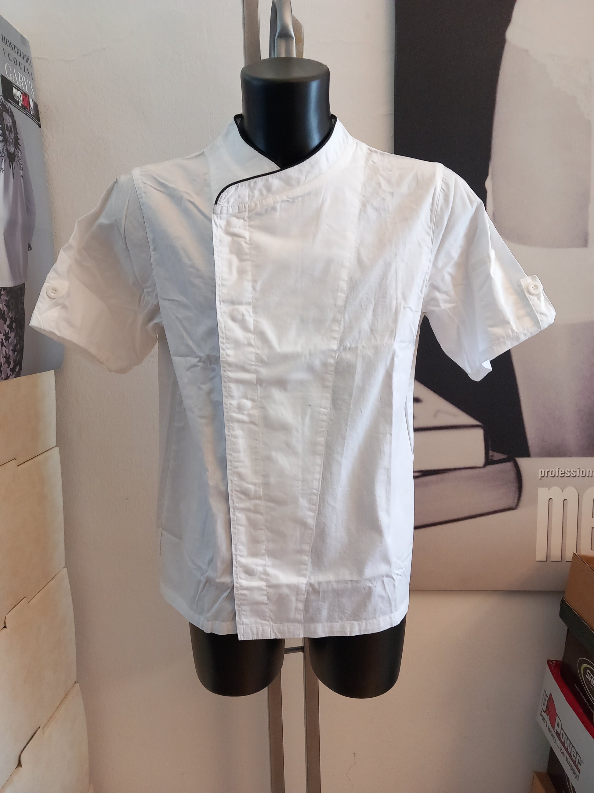 La giacca è a MANICA CORTA ; 100% cotone tranne il retro che ha una rete traspirante elasticizzata in poliestere per aumentare la comodità di movimento e la leggerezza.